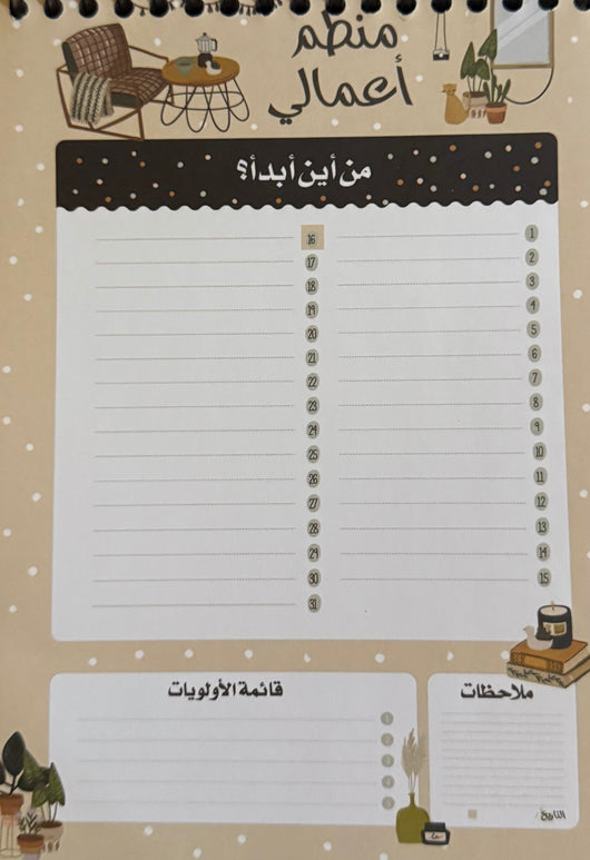 منظم أعمالي” هو مفكرة عملية مصممة لمساعدتك في تنظيم الأعمال اليومية وتسجيل المهام بوضوح. مما يسهل متابعة الإنجازات وإدارة الوقت بكفاءة. المفكرة تتيح لك ترتيب الأولويات، كتابة الملاحظات المهمة، وتتبع الأهداف الشخصية والمهنية بطريقة منظمة.