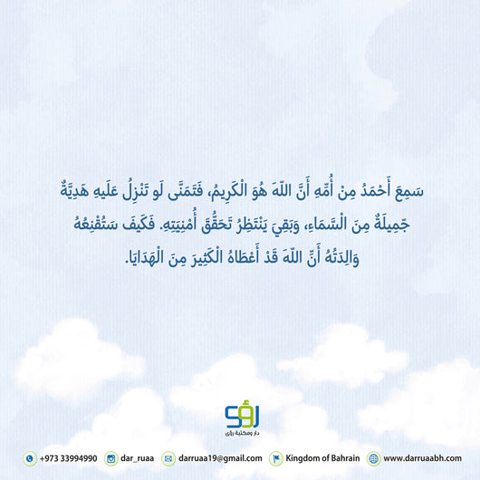 يستمع أحمد إلى حديث والدته عن أن الله هو الكريم، فيتمنى أن تصله هدية من السماء، وينتظر بلهفة تحقق أمنيته. تدور أحداث القصة في إطار بسيط ومباشر يعرض مفهوم الكرم الإلهي بطريقة تربوية تناسب عقل الطفل. تسعى الأم عبر الحوار والتوضيح إلى أن تجعل أحمد يدرك أن الله قد منحه بالفعل أعظم النعم والهبات التي تحيط به كل يوم. القصة تقدم فكرة إيمانية واضحة من خلال موقف واقعي مألوف، لتساعد الطفل على الربط بين الإيمان بالله وتجليات كرمه في حياته اليومية.